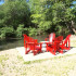 Gardens full of beautiful flowers and trees lead the way out to the river, where a number of tables and Adirondack chairs are set up for visitors to enjoy.